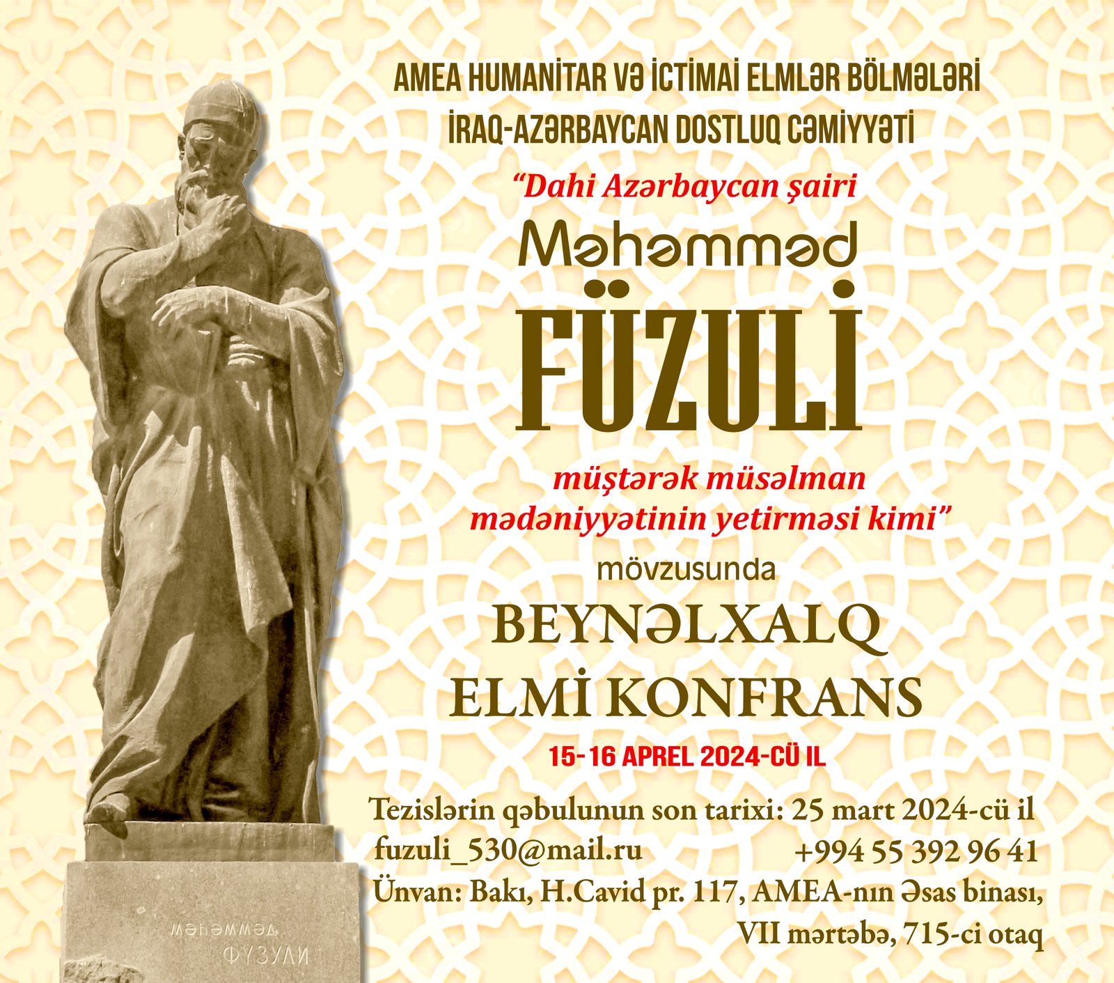 Мухаммад Физули, художественно обобщивший величайшие достижения устной и письменной традиции народов Востока, создал превосходные образцы художественной поэзии на трех языках, вобрав в себя все ценности общемусульманской культуры. 15-16 апреля 2024-го года при совместной организации Отделений Гуманитарных и Общественных Наук НАНА совместно с Обществом Иракско-Азербайджанской Дружбы, состоится международная научная конференция «Великий азербайджанский поэт Мухаммед Физули как представитель общемусульманской цивилизации», посвященная 530-летию со дня рождения великого поэта. Оргкомитет конференции объявляет о приеме тезисов для участия в конференции. Принимаются тезисы докладов, освещающих темы, посвященные изучению многогранного поэтического наследия и литературной школы Физули.